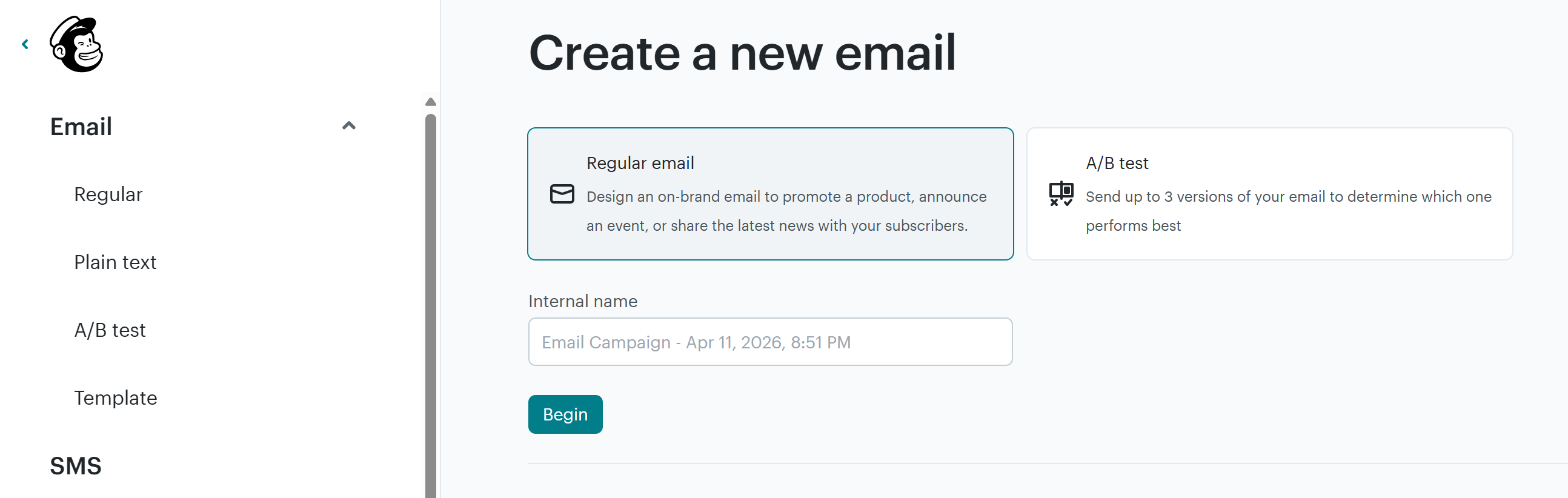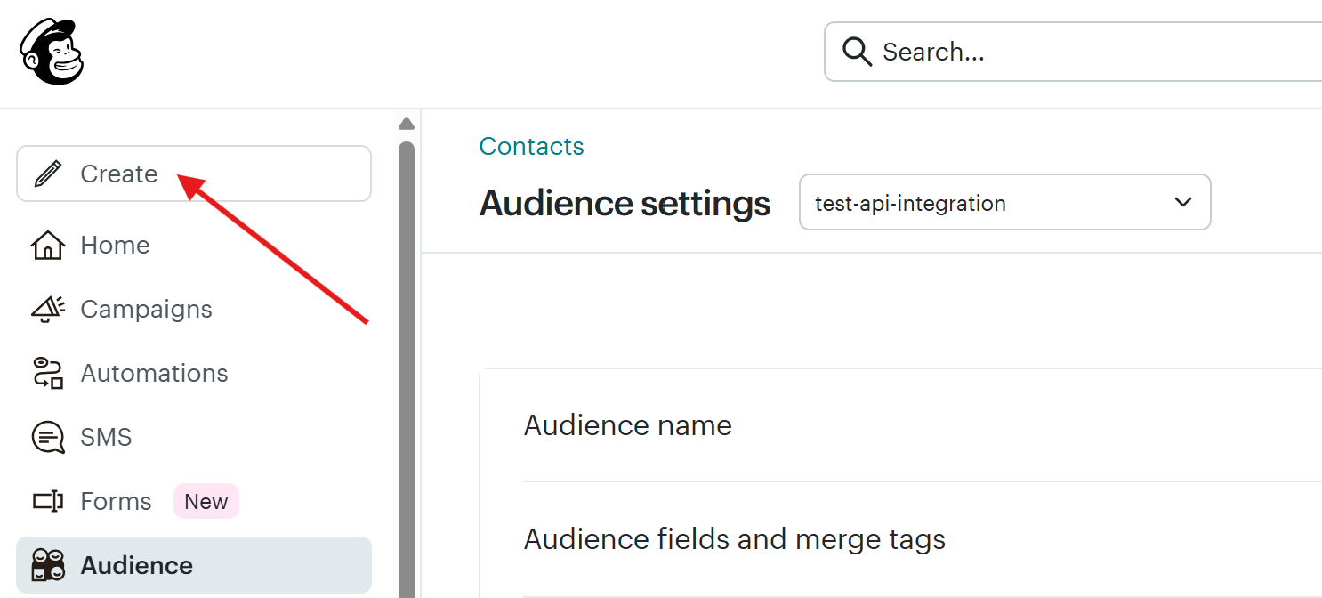 Go to your admin dashboard in Mailchimp and click on "Create":
