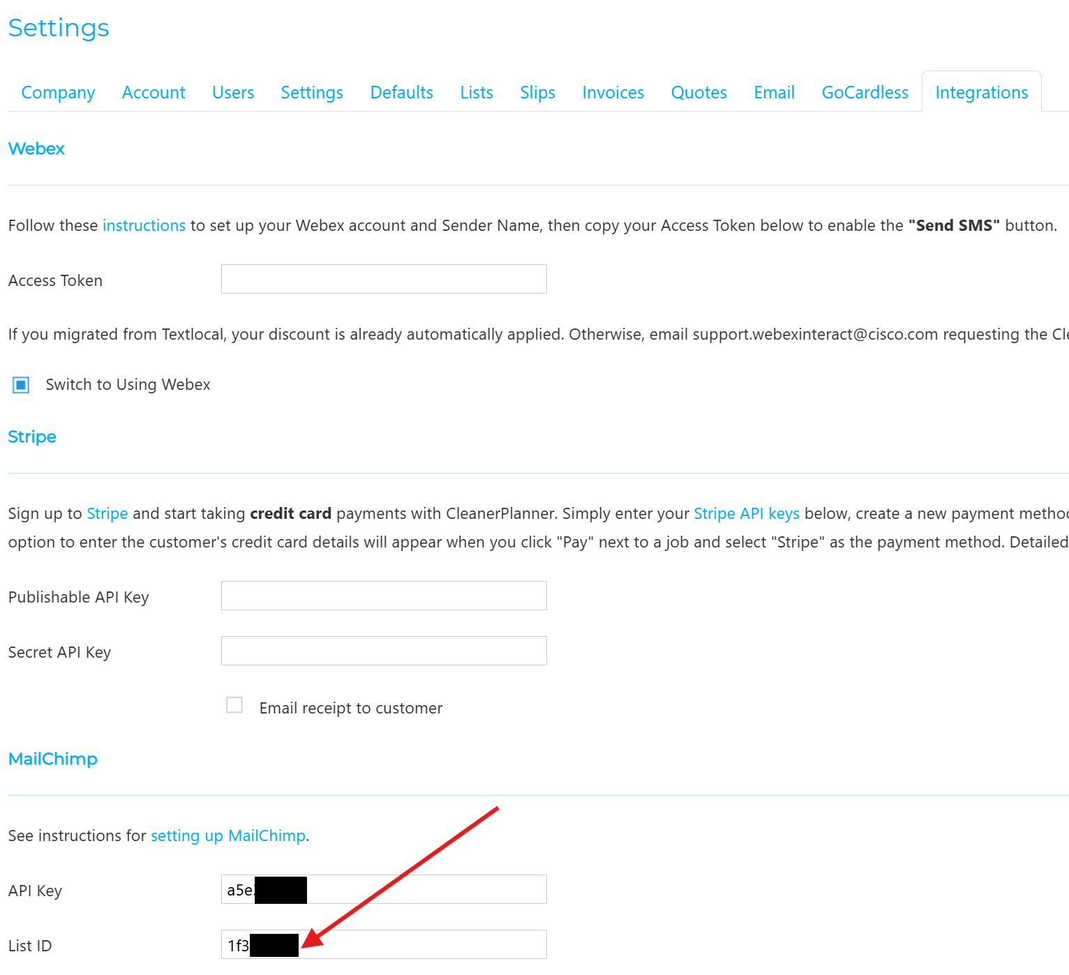 - Copy this key into your CleanerPlanner account > Settings > Integrations > MailChimp:
